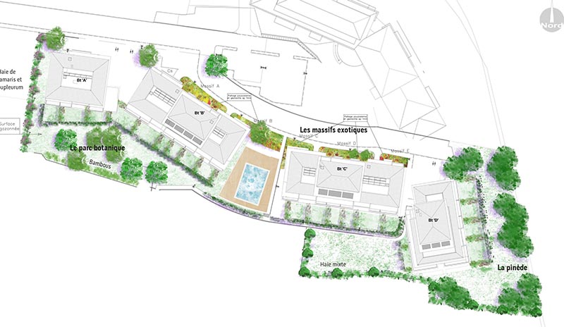 Les bâtiments s’intègrent dans un véritable parc ornemental
